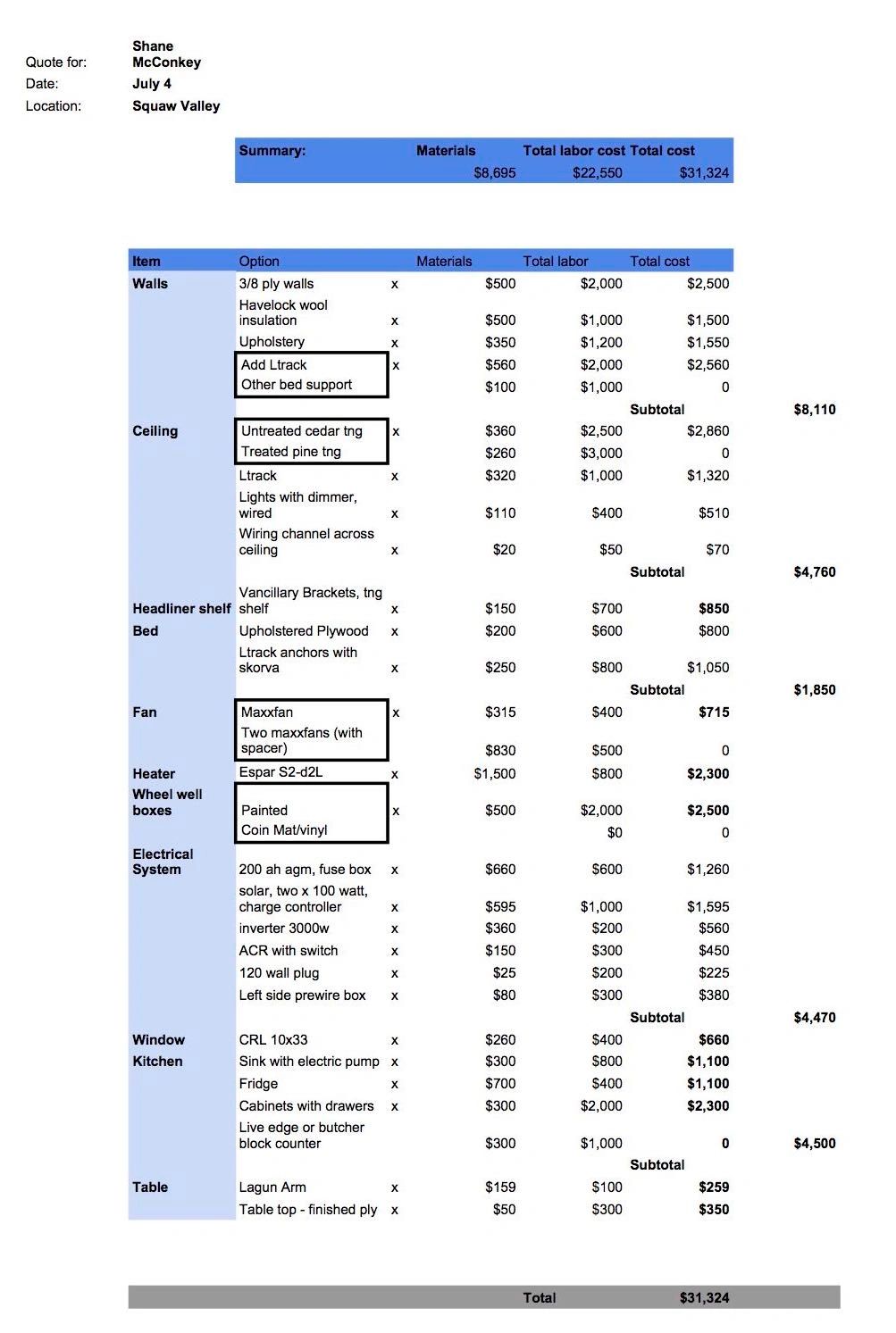 This is the Homey van, recently completed as a quarantine project. The quote below reflects everything that went into this van, as a baseline for what to expect.