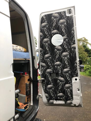 The ceiling gets the most, with a layer of 1 in Thinsulate, 1 in Polyiso, and EZ Cool to hold it all in. I use 3M 90 spray adhesive to stick the layers up initially, and the EZ Cool gets stuck up with reflective tape. The tape gets covered with the wooden slats, so everything is held up mechanically.